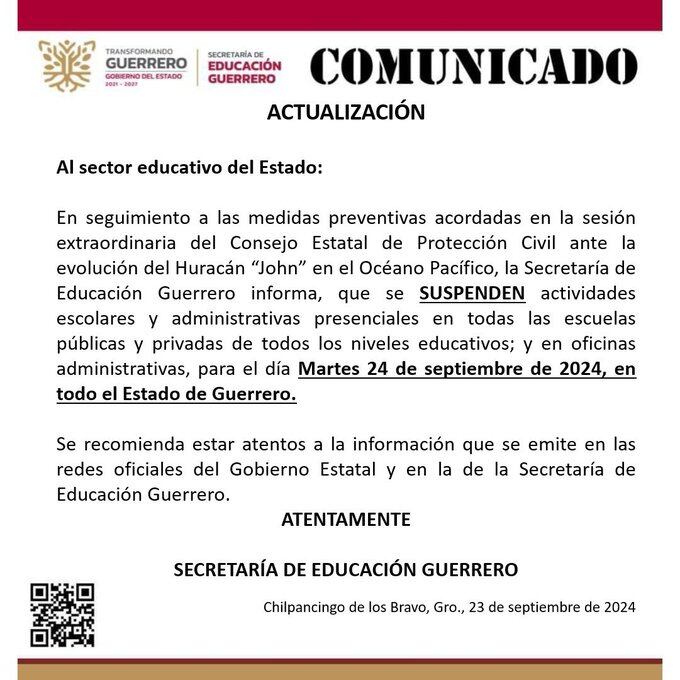 Suspenden labores en todo el estado de Guerrero El Gobierno de Guerrero ha anunciado la suspensión de labores en todo el estado de Guerrero, incluyendo actividades escolares y administrativas presenciales. “[…] se SUSPENDEN actividades escolares y administrativas presenciales en todas las escuelas públicas y privadas de todos los niveles educativos; y en oficinas administrativas, para […]